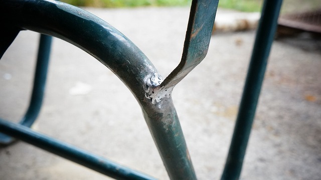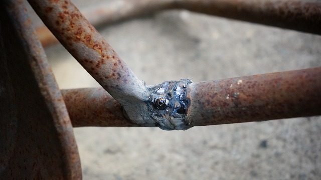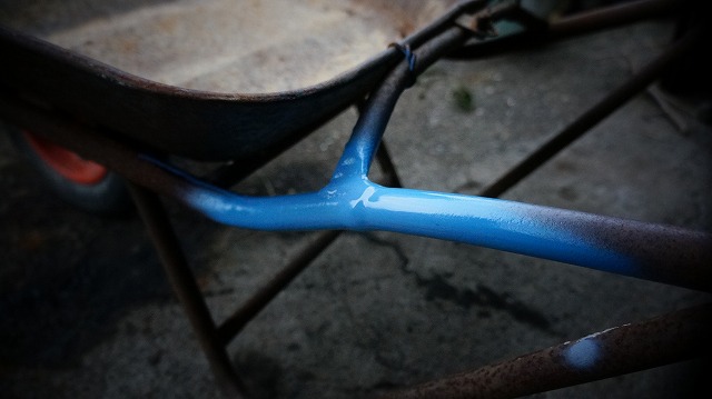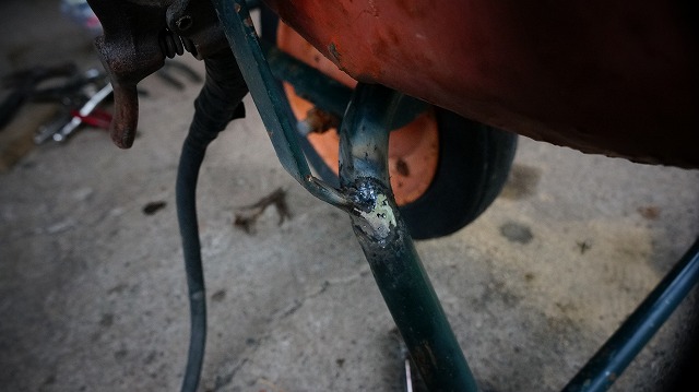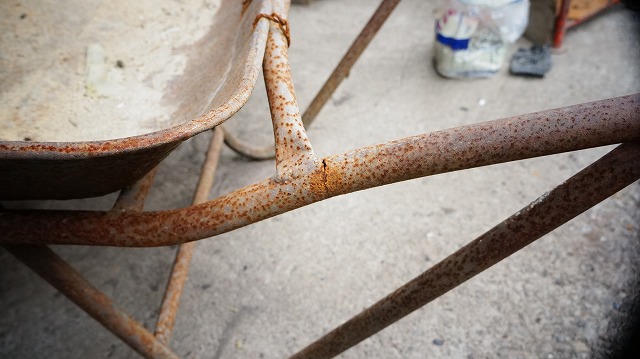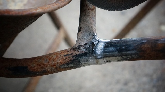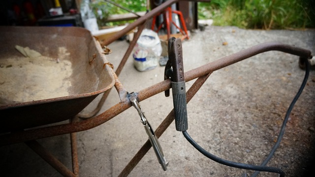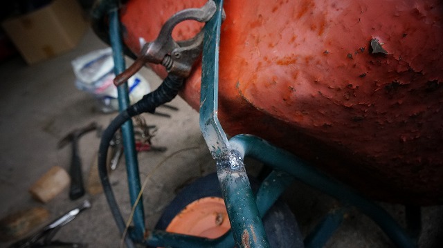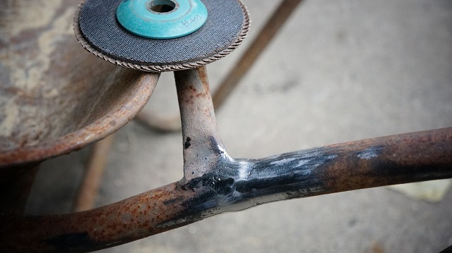 作業用の 一輪車に 亀裂が 入り 、そのまま使うと もげそうなので 溶接して 直しました 。