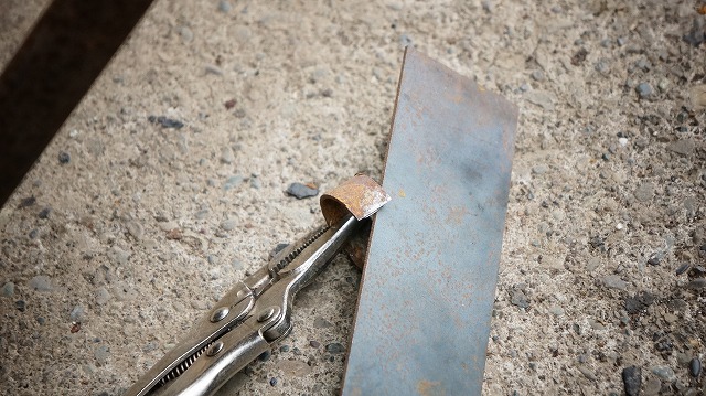 バイス・プライヤーで 材料を 挟み 切った部分に 鉄板を 差し込んで あおったら 広がってきました 。