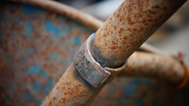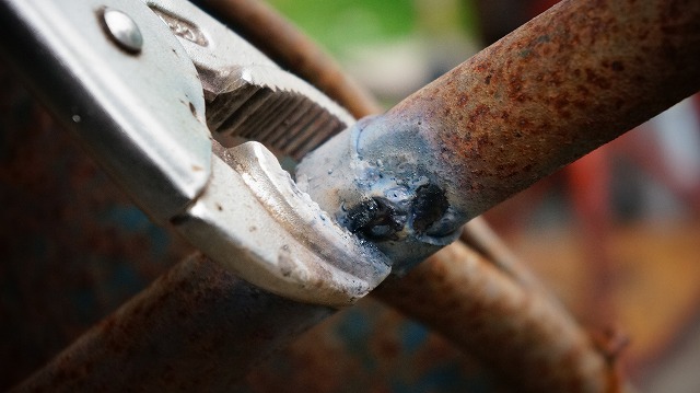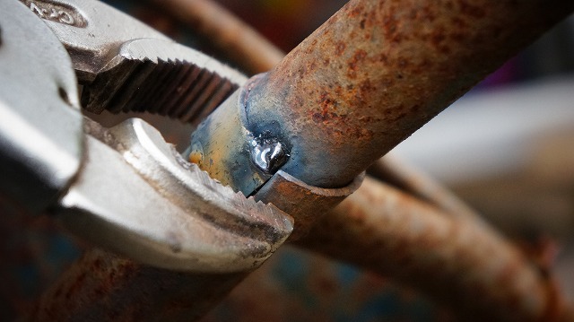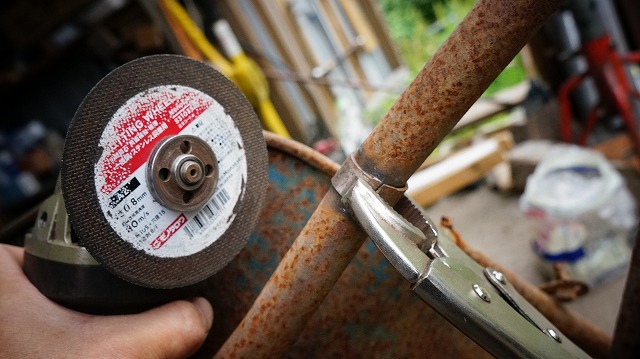 グラインダーで切って バイス・プライヤーで 固定して 溶接してみます 。