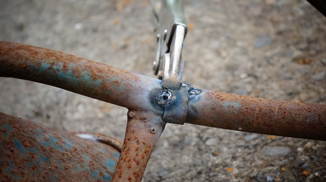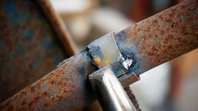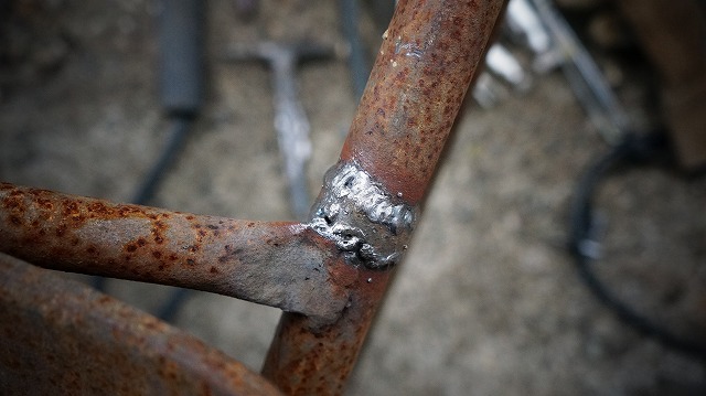 とりあえず バイス・プライヤーで 材料を 固定しながら 、ちょんちょんと 点付けして 溶接してみます 。