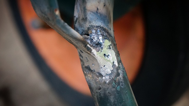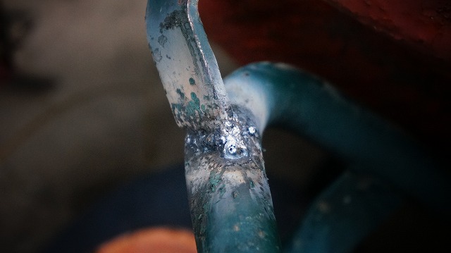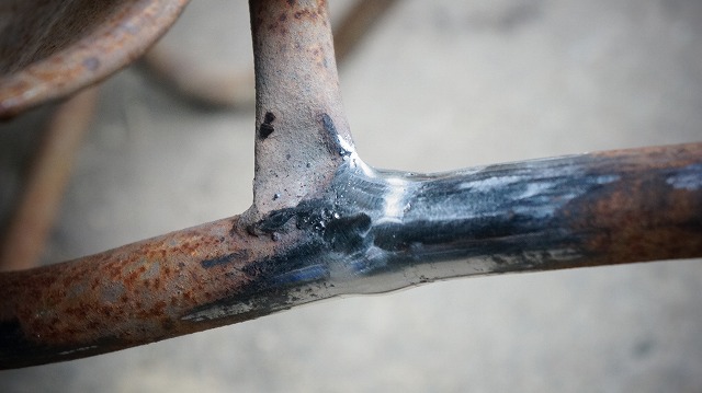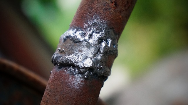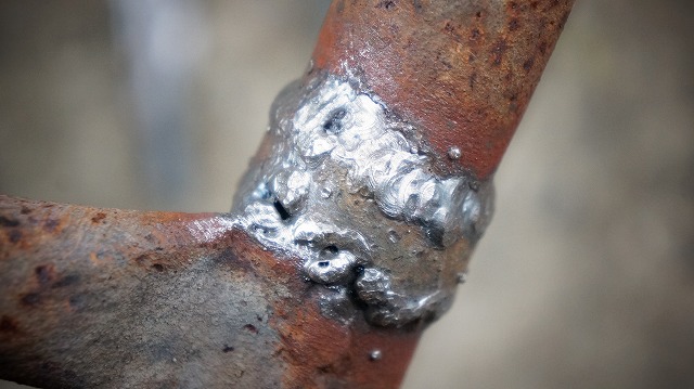 表面の かす (スラッグ ) を 叩き落とすと 実際に 鉄が 溶接されている様子が 見えてきました 。