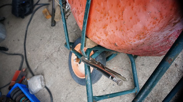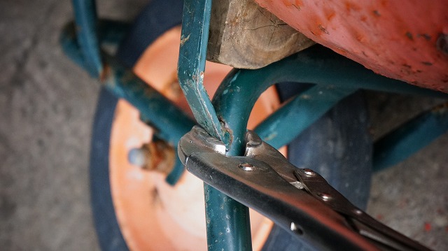 ウォーター・ポンプ・プライヤーで 一輪車のパイプに合うように 材料を 変形させます 。