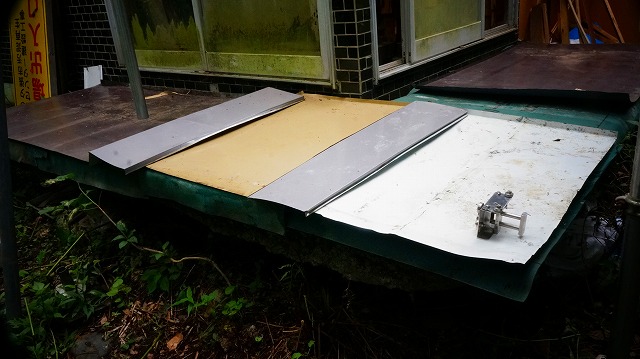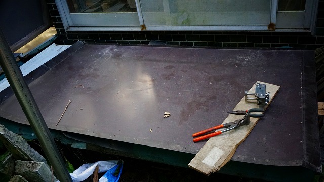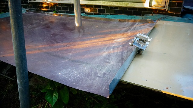 一番上の トタン板は 、水上になる部分と側面部分を 少し立ち上げ 、水が 水下に流れていくように意図してみます 。