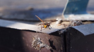 防水紙の下 、板の 隙間で 越冬していた 蜂 ( はち ) 。温 ( あたた )かくなったので 、もぞもぞと 動けるようにはなったが 、まだ 飛ぶことは できない ・・・  そんな気温 ・・・ そんな エネルギー状態の日 ・・・