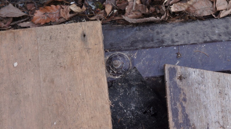 面戸板を はずして ボルトの頭に メガネレンチをかけて 下から 木で落ちないように固定している状態 。