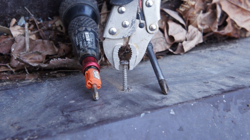 ビス頭が 少し出てきたら 、ロッキング・プライヤーで かじって 取れるまで 回す 。