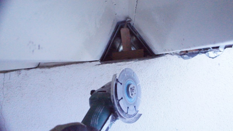 面戸板が はずれる前提として 、その下のモルタルを少し取らねば 取れなかったので 、ダイヤモンド( コンクリート )カッターで 少し切った 。